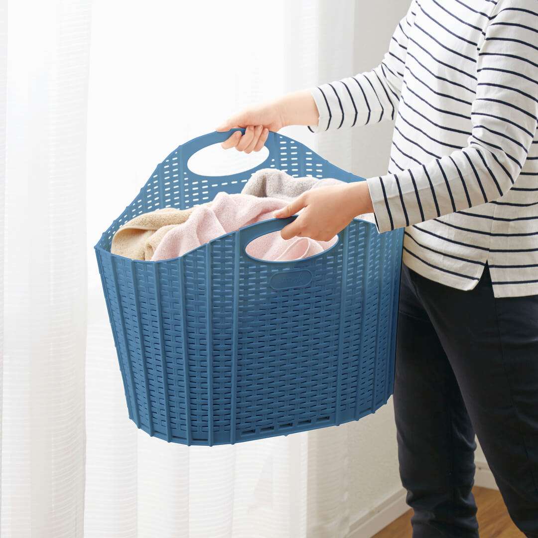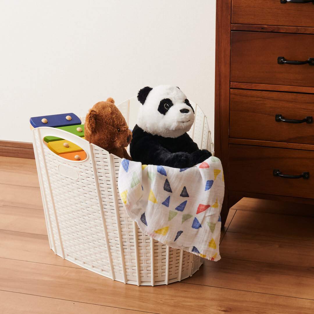 ラタン調のデザインはかわいいだけでなく、中身が見えにくいことから、ごちゃつきがちな子供のおもちゃ入れなど目隠しをしたいものの収納にも便利です。持ち運びしやすい取手付きなのも◎。使わないときはコンパクトに折りたたんでおけて、その薄さはなんと約3.5cm!洗面台と洗濯機のちょっとした隙間にスッと入るので収納場所にも困りません。たくさんのお買い物をしたとき用に車に積んでおくのにもぴったり。約38Lのたっぷり容量で家族みんなの洗濯物や、ベッドシーツ、カーテンなどもしっかり入りきります。