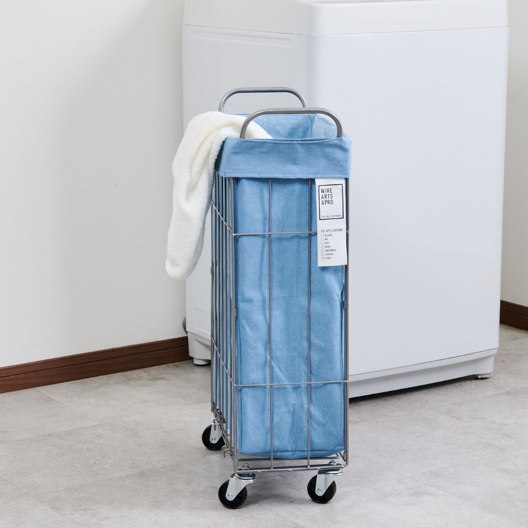 生活感が出やすく乱雑になりやすい洗面所、洗濯かご1つ意識するだけですっきりとした空間に変えることができます。そこでおすすめなのが、こちらのランドリーバスケットです。スタイリッシュでシンプルなデザインが魅力的で、洗濯物をすっきりとまとめておくことができるバスケットとなっています。フレームの内側に取り付けられているファブリックカバーは、汚れてきたら取り外して丸洗いすることができます。洗濯物が見えないよう工夫されているこちらのカバーは、もともと水や汚れをはじくような特徴を持っているのもポイントです。                                                                                                  サイズ:W37×D21×H70 cm (ハンドル高さ:約6.5cm / キャスター高さ:約7cm) 重量:2.4kg 素材:[ワイヤー]スチール[布袋]コットン 耐荷重:30kg