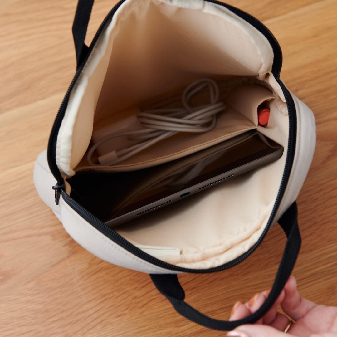 内側のポケットにもクッション性があるため、タブレットを入れたとき、画面への衝撃も軽減してくれます。ごちゃつきがちな充電ケーブルやタッチペン。内側にタッチペン専用の細長いポケットと充電ケーブルやマウスを収納できるポケットをつけました。