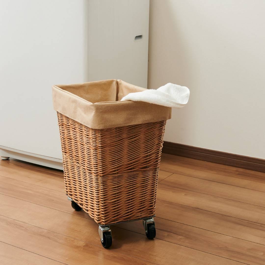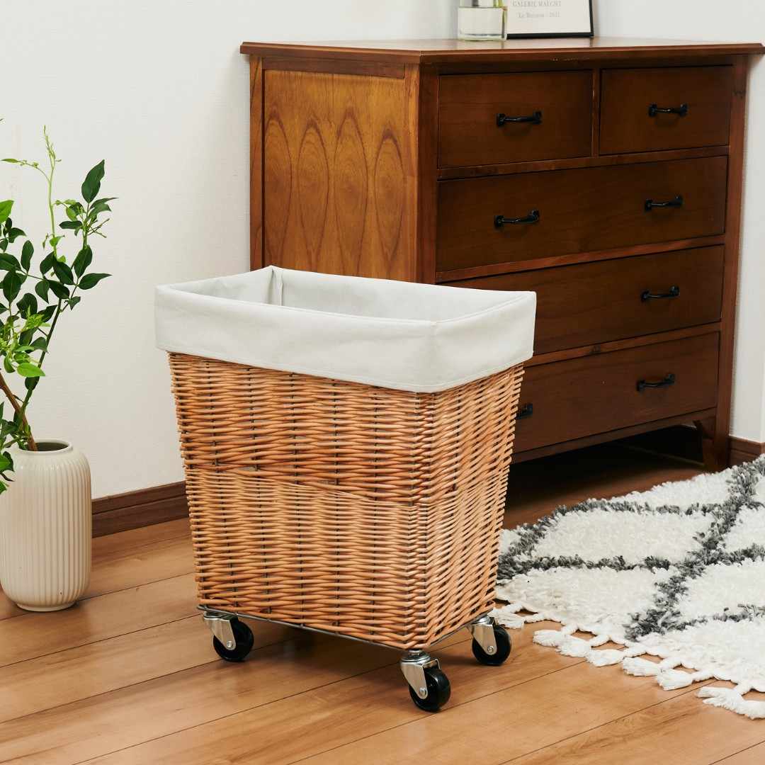インナーバッグ付きのため、バスケット素材との摩擦で中の物を傷めてしまう心配もありません。持ち上げなくてもコロコロと引っ張るだけで簡単に移動ができるキャスター付きです。重いものを入れていてもラクに動かせるのはうれしいポイント。                                          サイズ:サイズ:W39×D26×H39cm [キャスター高さ]約7cm 内容量:34L 素材:[バスケット]柳[ワイヤー]スチール[内袋]ポリエステル・コットン(内側ラミネート加工) 耐荷重:30kg