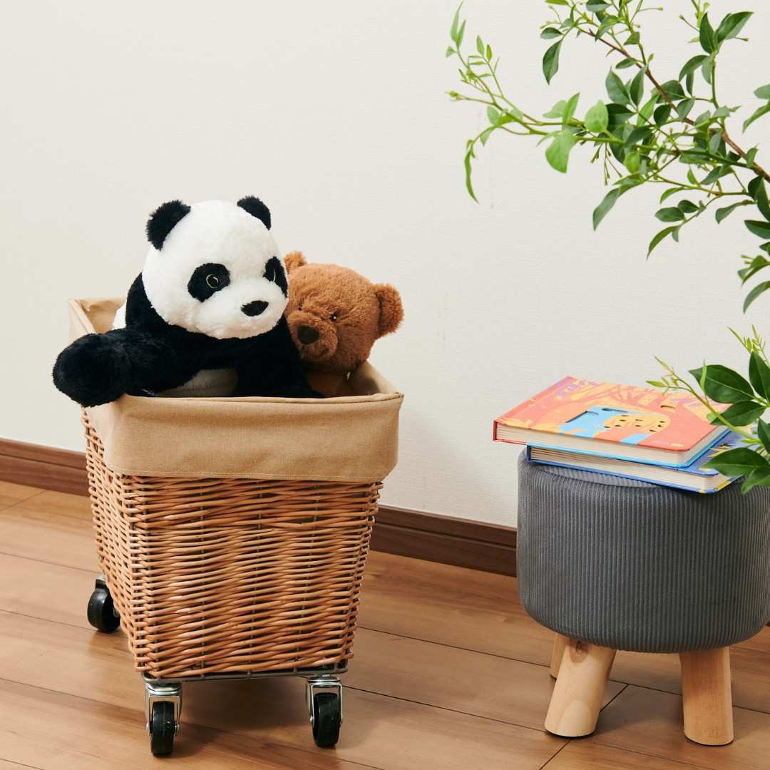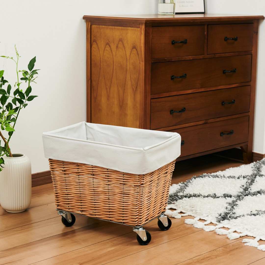 インナーバッグ付きのため、バスケット素材との摩擦で中の物を傷めてしまう心配もありません。持ち上げなくてもコロコロと引っ張るだけで簡単に移動ができるキャスター付きです。重いものを入れていてもラクに動かせるのはうれしいポイント。                                                              サイズ:W42×D26×H28cm [キャスター高さ]約7cm 内容量:28L 素材:[バスケット]柳[ワイヤー]スチール[内袋]ポリエステル・コットン(内側ラミネート加工) 耐荷重:15kg