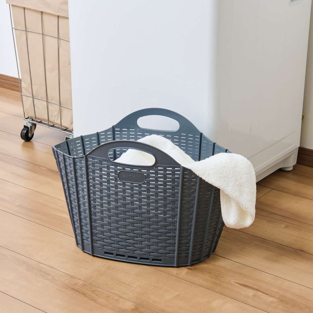洗面台と洗濯機のちょっとした隙間にスッと入るので収納場所にも困りません。たくさんのお買い物をしたとき用に車に積んでおくのにもぴったり。コンパクトながら約20Lの容量です。家族の洗濯物はもちろん、別洗いしたい白物を分けたり、お子さんのおもちゃ入れに、と使い勝手は様々。