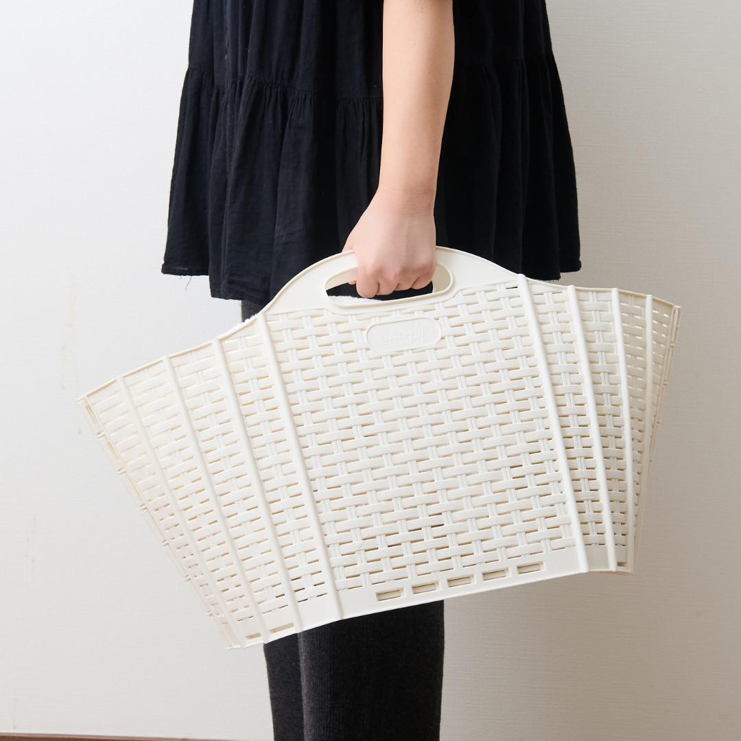 ラタン調のデザインはかわいいだけでなく、中身が見えにくいことから、ごちゃつきがちな子供のおもちゃ入れなど目隠しをしたいものの収納にも便利です。持ち運びしやすい取手付きなのも◎。使わないときはコンパクトに折りたたんでおけて、その薄さはなんと約2.5cm!