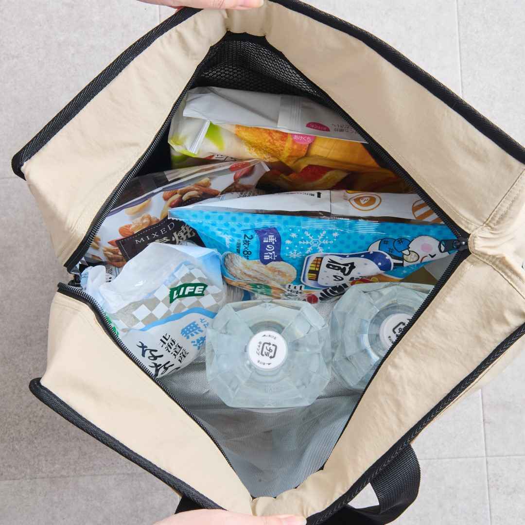 ペットボトルやファミリーパックのお菓子も入るので買い物の量が多い日にもぴったり。この保冷バッグなら内側の片側がメッシュポケットになっているので保冷剤を複数個お使いいただければ、全体を冷やすこともできます。