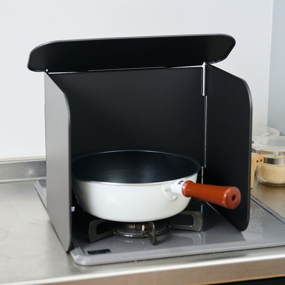 油ハネを防止するのはもちろん、コンロの火が消えないよう風除けの役目も果たします。火が消える心配なく落ち着いて調理できるので、慣れない場所での食事の支度にぜひ常備おきたいアイテムです。使用後は簡単に分解できて水洗いOK!食洗機もお使いいただけます。使用後はコンパクトに折りたたんでおけるので場所を取りません。コンロ横に立てかけて、フライパンを収納している戸棚の中、オーブンなどの調理家電との隙間などちょっとしたところにスマートに収納できます。【商品に関して】サイズ:[使用時]幅40.3×奥行24.7×高さ39cm[収納時]幅40.3×奥行1.5×高さ29cm 重量:900g 素材:[面材]鋼板(ふっ素樹脂塗膜加工)[芯棒]ステンレス鋼(クロム18%、ニッケル8%) 原産国:日本 【お取り扱いに関して】ビルトインタイプのIH、ガラストップ等の表面が平らなガス機器のみ使用可能です。 ・食器洗い乾燥機不可