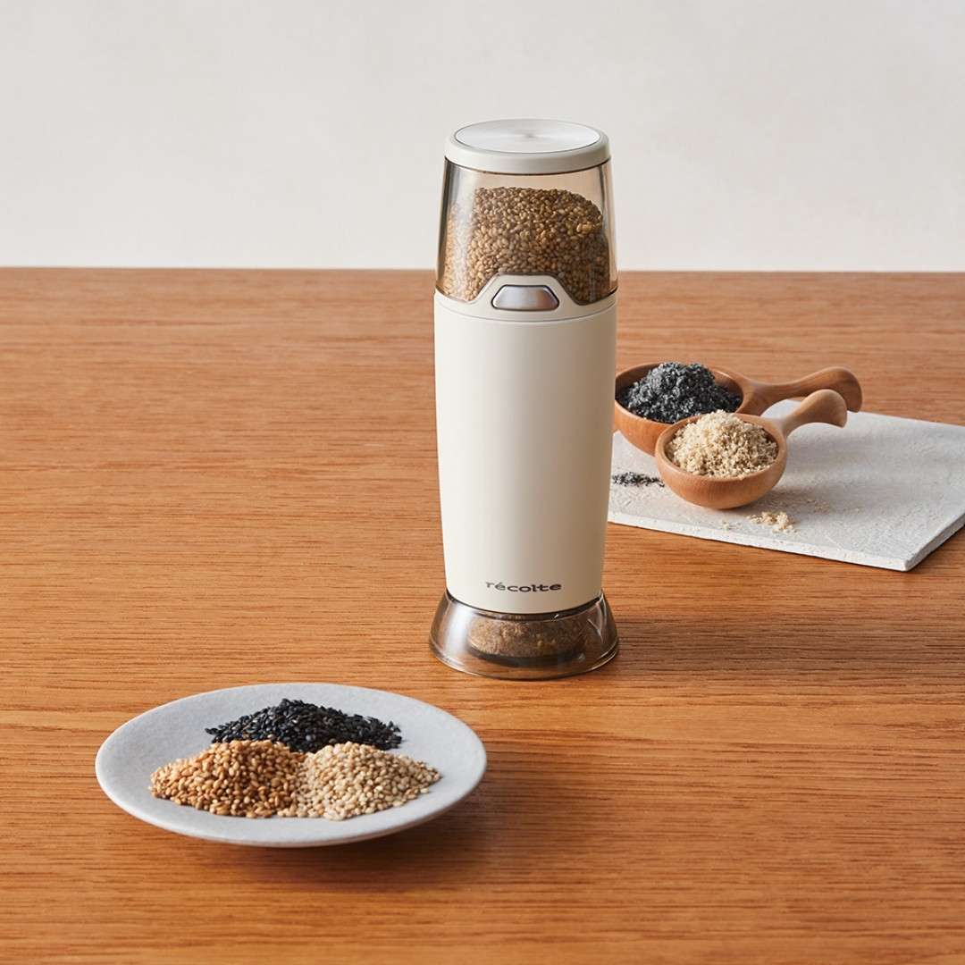 そんな面倒さを解消し、食卓でもキッチンでもお皿の上にパパッと振りかけられます。しょう油瓶やカトラリーケースなどと並べて置きっぱなしにしていても違和感のないスタイリッシュなデザインです。クリームホワイトのやさしい色味はどのご家庭の食卓にもキッチンにもよくなじみます。ゴマを入れるコンテナ部はクリア素材になっていて、残量が一目でわかるから補充や買い物のタイミングを逃しません。蓋が上に付いているためボディの上から入れるだけの簡単補充。
