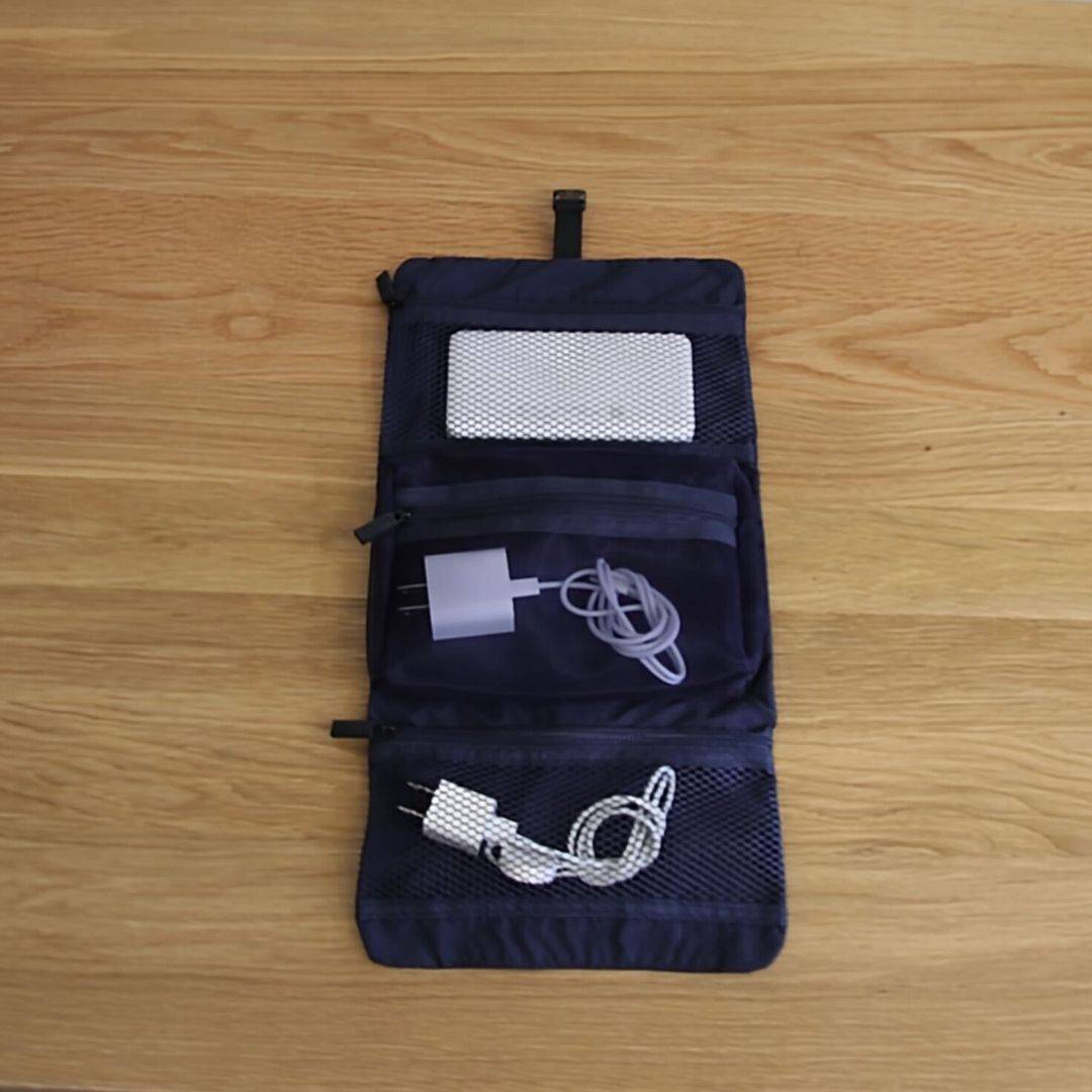 折り畳むことでよりコンパクトになり、小物をすっきりまとめることができます。濃いめのカラーになっているので、汚れも目立ちにくく、旅先でも気兼ねなくお使いいただけます。  メッシュ素材で中身が一目でわかる2つのジッパーポケットを備え、アメニティ、充電器、ケーブル、小物などをすっきり収納することができます。
