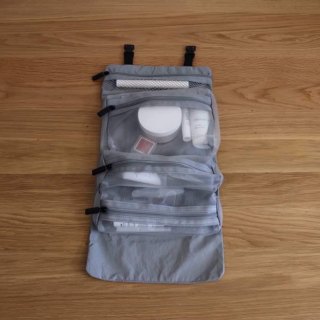 このトラベルポーチはメッシュポケットや取り外し可能なポーチ付きで、旅行に必要なアイテムをひとまとめに整理できる多機能ポーチです。