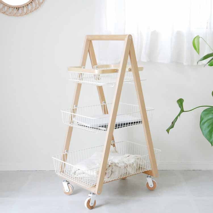 ちょっとここに収納をプラスしたいに答えてくれるスチールに木製パーツのアクセントがかわいいキャリーワゴンです。リビングでは雑誌やブランケットを、クローゼットではバッグや帽子などの小物収納や洋服を畳んで入れても◎。