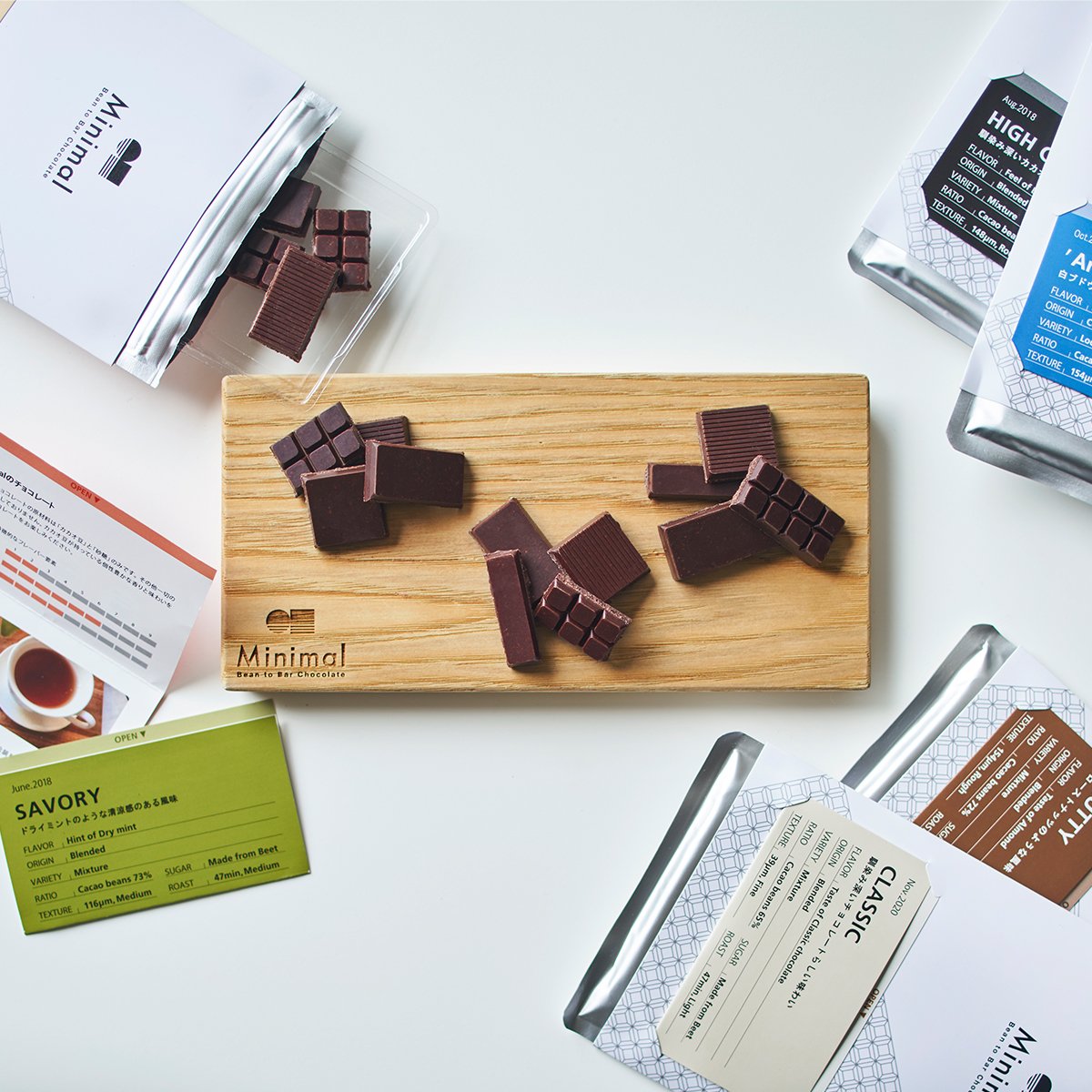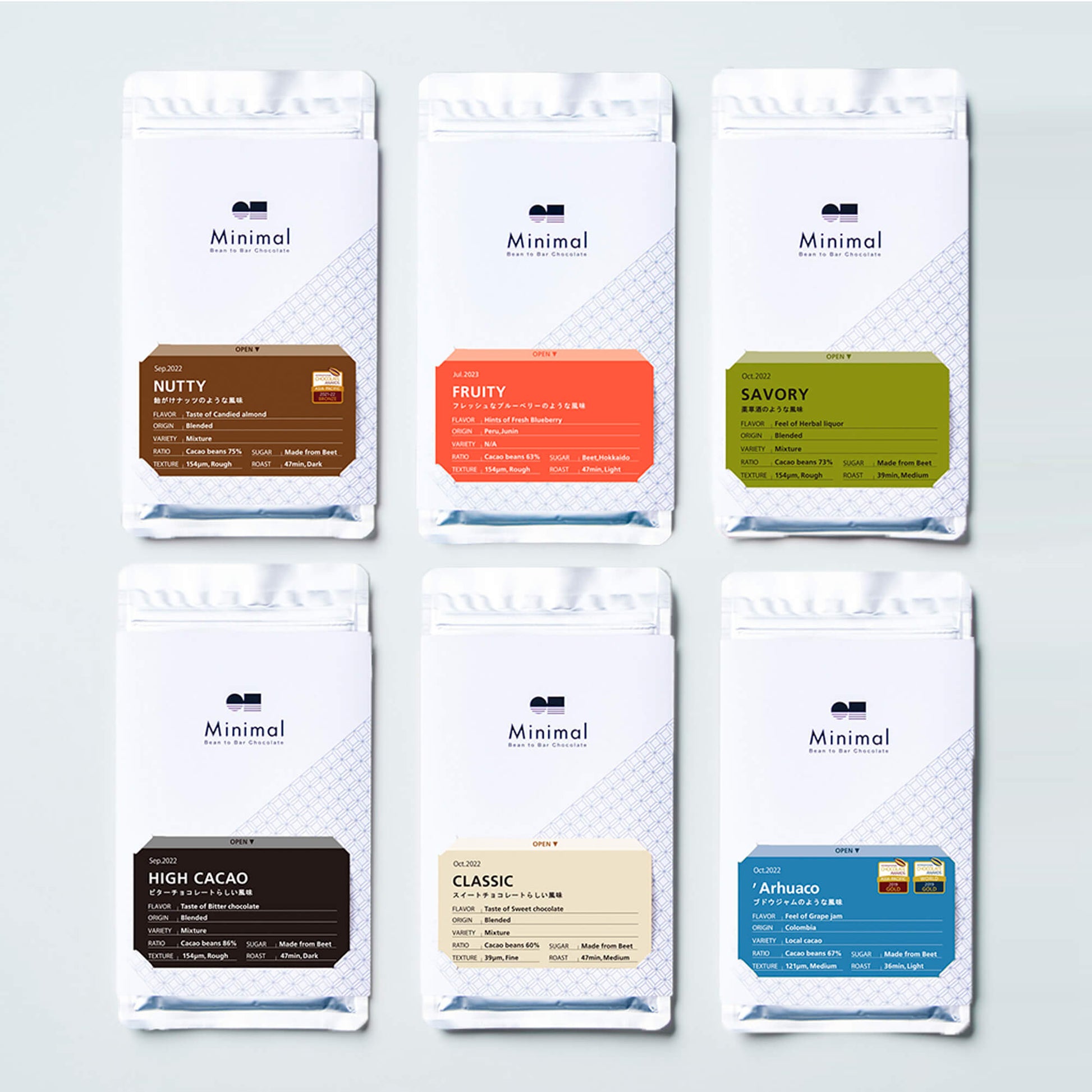 定番6種の板チョコレートの原料はカカオ豆と砂糖だけ。シンプルな素材だけですが、カカオの産地や焙煎など、素材と製法の組み合わせによってその風味は多彩です。最小限の素材とこだわりの製法で引き出す、カカオ本来の多様で異なる風味を食べ比べてみてください。