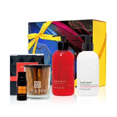 THANN誕生以来、圧倒的に支持されている香り《アロマティックウッド》のエッセンシャルオイル10mlと、リュクスなバスタイムを演出するシャワージェルに、なめらかなテクスチャーで肌をしっとりうるおすボディミルクをチョイス。